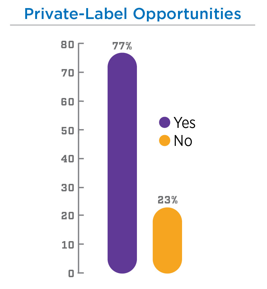Some say there is nothing more reliable than providing private-label product lines, as those sales are to organizations that will purchase and consume large amounts of products. For distribution, this strategy seems to be a smart move, with more than 75% of respondents engaging in private-label offerings. Is this the most profitable move? That can be debated as 52% said they see less than 20% of revenue tied to private-label product lines.