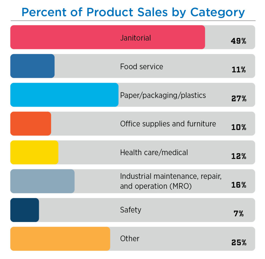 Distribution companies serving a broad clientele offer a diverse range of products for various market segments (see the “Percent of Product Sales by Categories” chart on the next page). Yet this is the cleaning industry, so it is no surprise that the janitorial product category dominated all others. Nearly 50% offer janitorial products more than any other product type, followed by paper and packaging products at 27%, and industry maintenance and repair products at 16%. In total, some eight different product category types were reflected by respondents. It’s evident that distributors and those who are part of the global cleaning supply chain are meeting customer needs by investing in a diverse portfolio of product offerings.