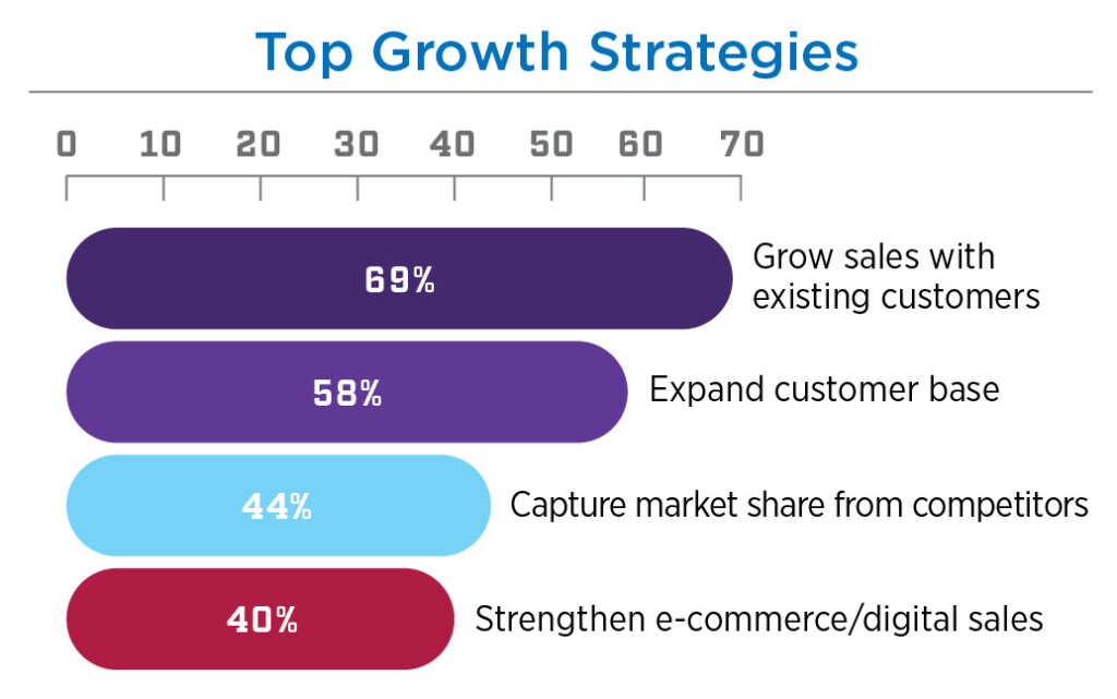 Distribution companies seeking to thrive in today’s competitive and complicated marketplace are smart to employ a combination of traditional and innovative growth strategies (see the chart “Top Growth Strategies” below). Some respondents indicated they were growing, with some strategies including increasing warehouse capacity and increasing the sales force team. Yet the vast majority see their existing customers as key to additional growth, with nearly 70% planning to sell more to existing clientele, with 58% looking to expand their customer base. Then we have nearly 44% who will not only do that but also look to capture market share from their competitors. Almost 40% of those surveyed indicated they have strengthened their e-commerce/digital sales strategies to be more competitive.